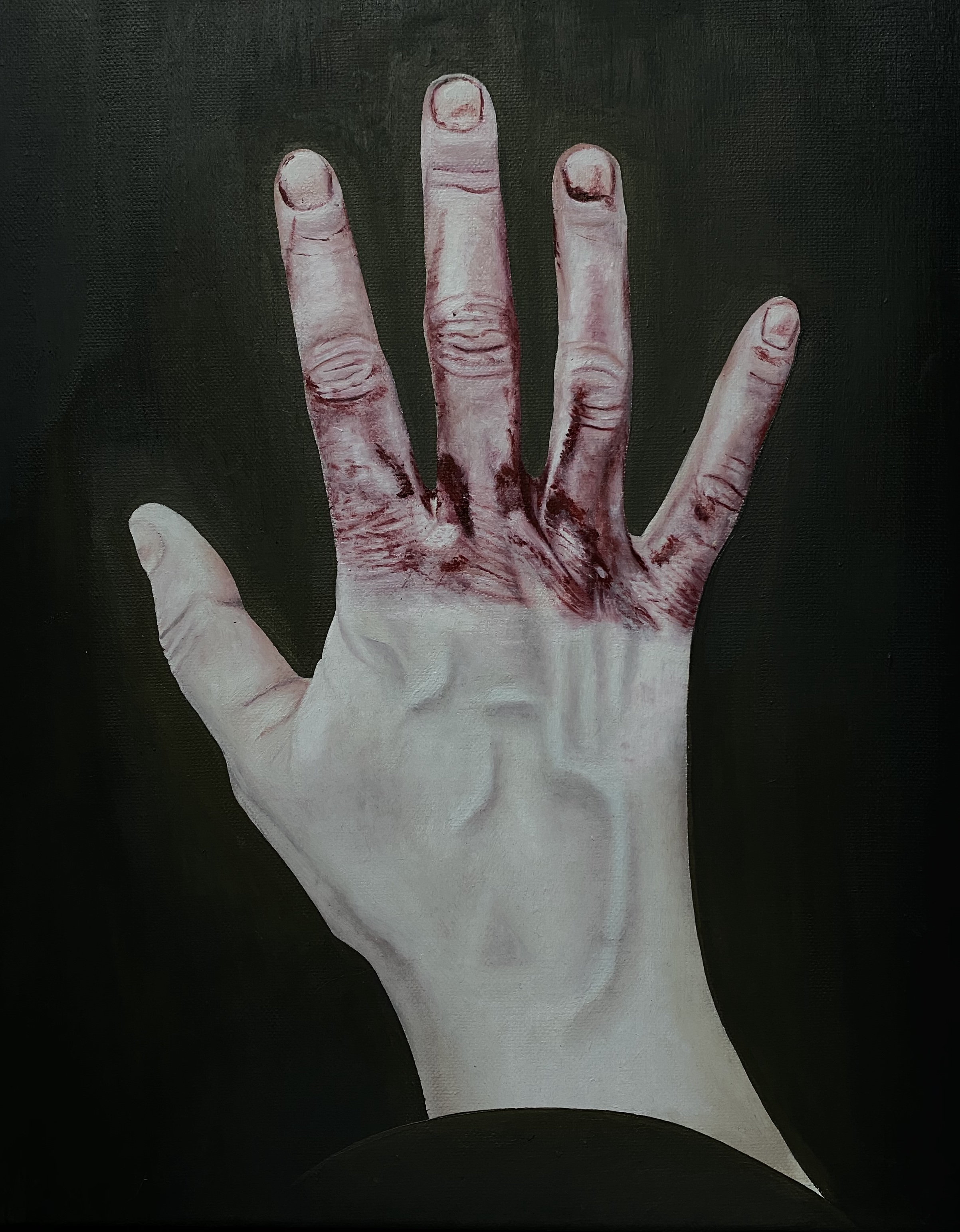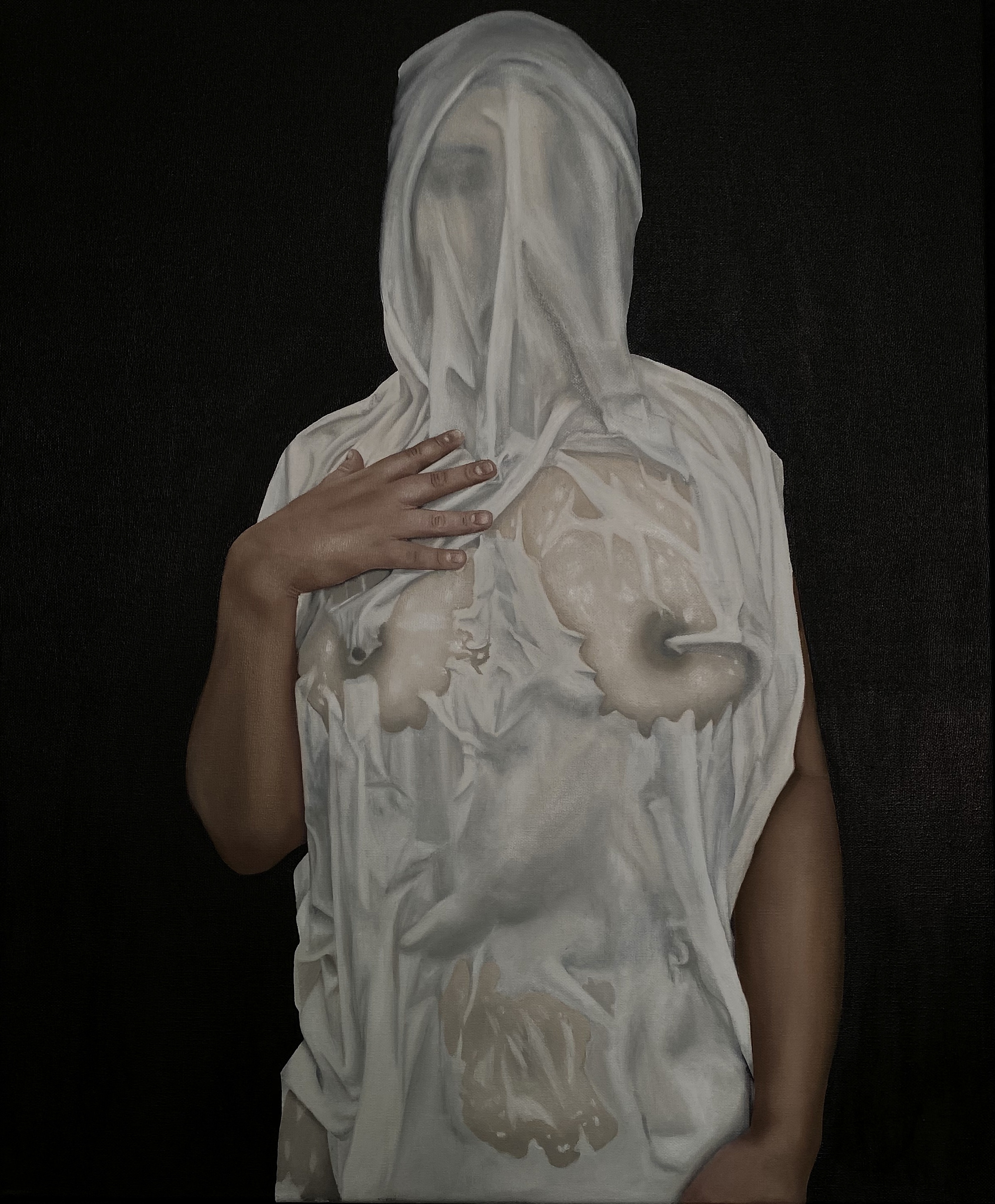 Katelynn Tracy is a painter who lives and works in Des Moines, IA. Her work has been shown in physical and digital galleries and zines across the United States, and is known for its instantly arresting nature and intimate voyerism. There is a certain fascination with the macabre that is consistent within her paintings—be it through bold, dark color or unsettling subjects. Tracy sees art as a way to ask viewers a direct question, implicating them in the experience of a piece and encouraging them to question their roles as viewers, and their reactions to her work. Her current work centers around portraying female forms shrouded in wet cloths, a commentary on the hyper-sexualization of femme bodies and the weight of our gaze.