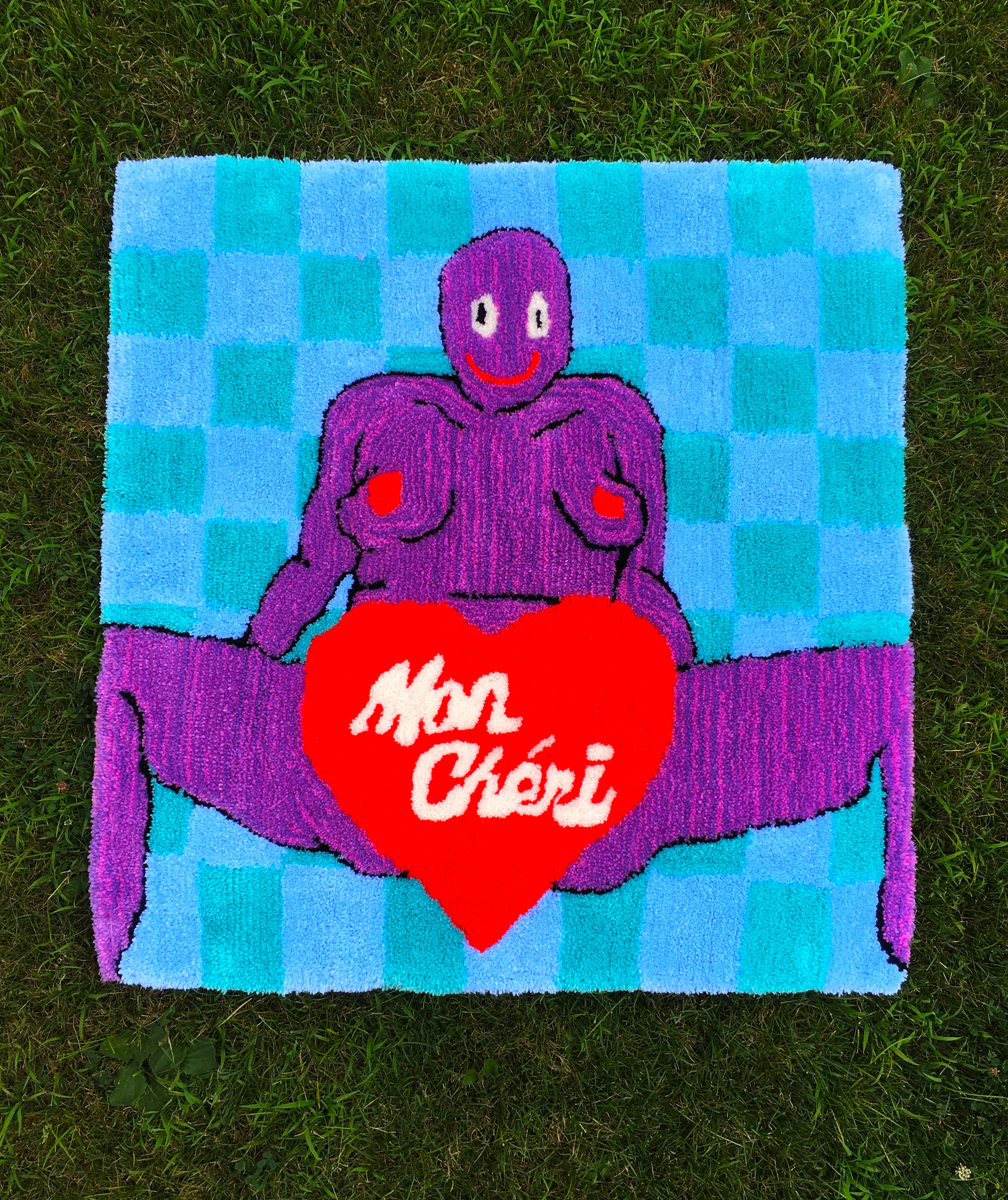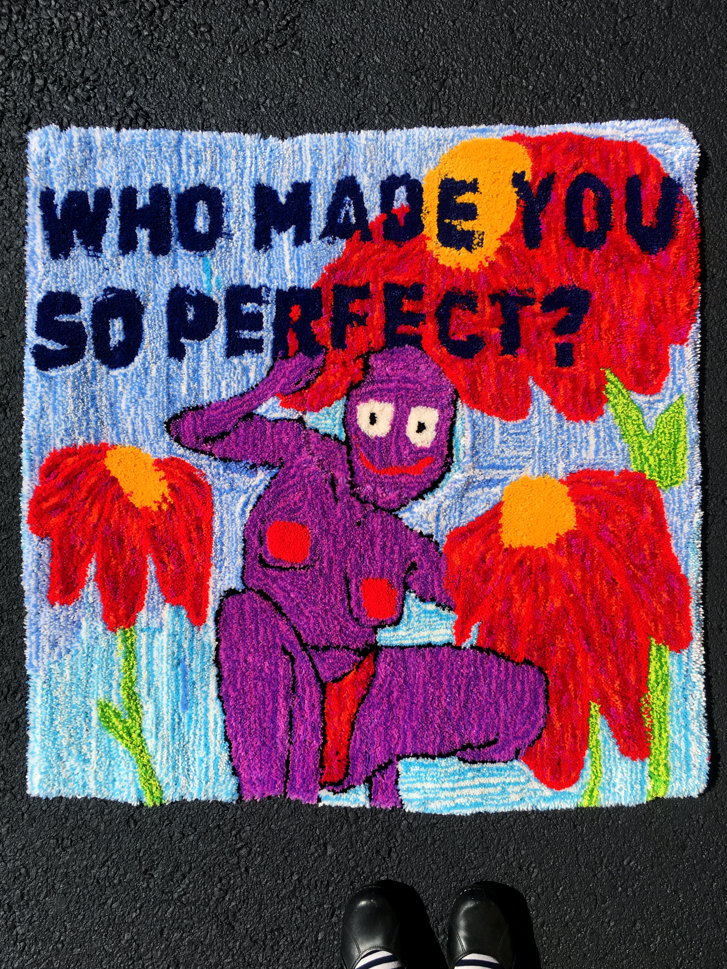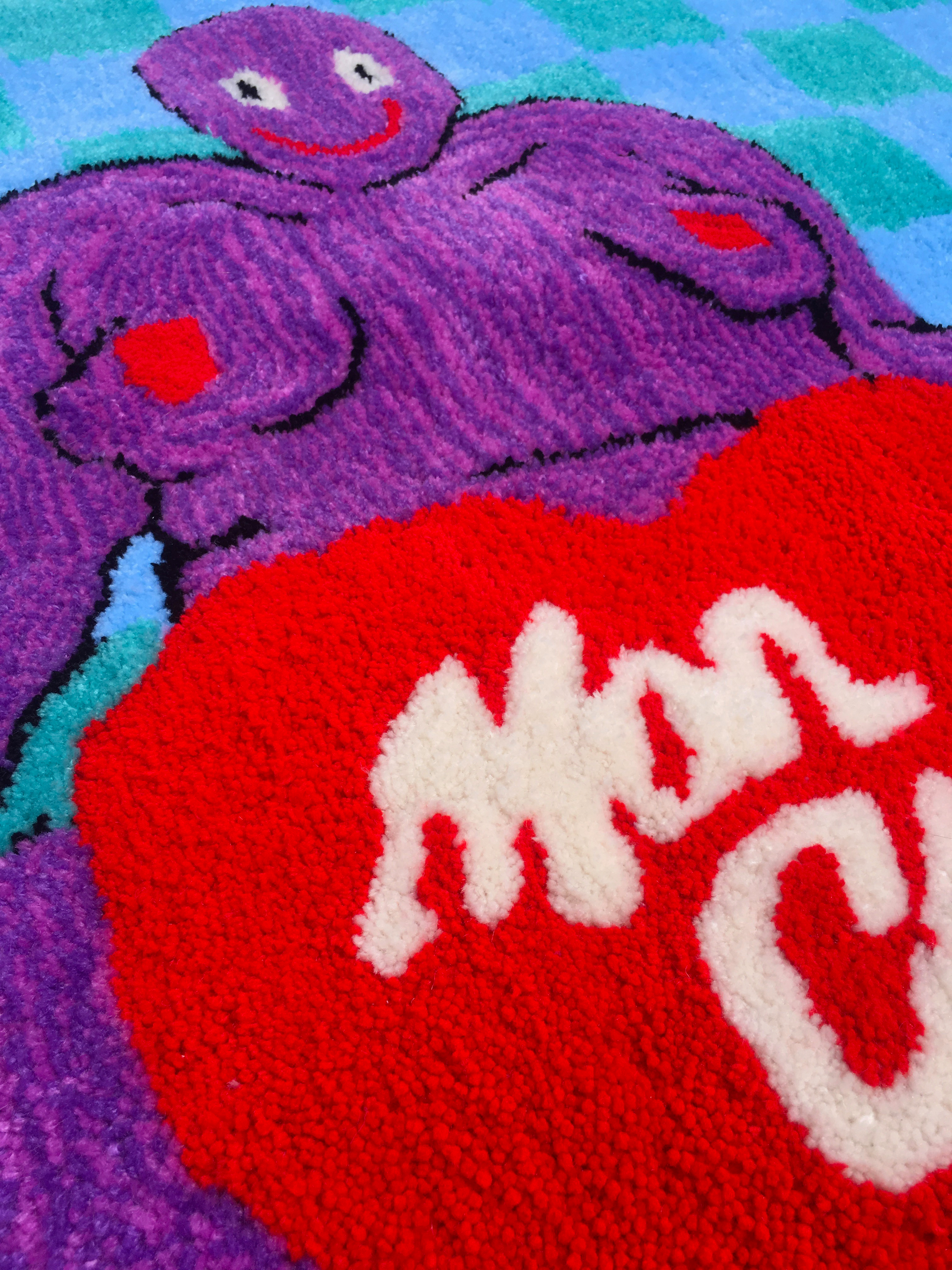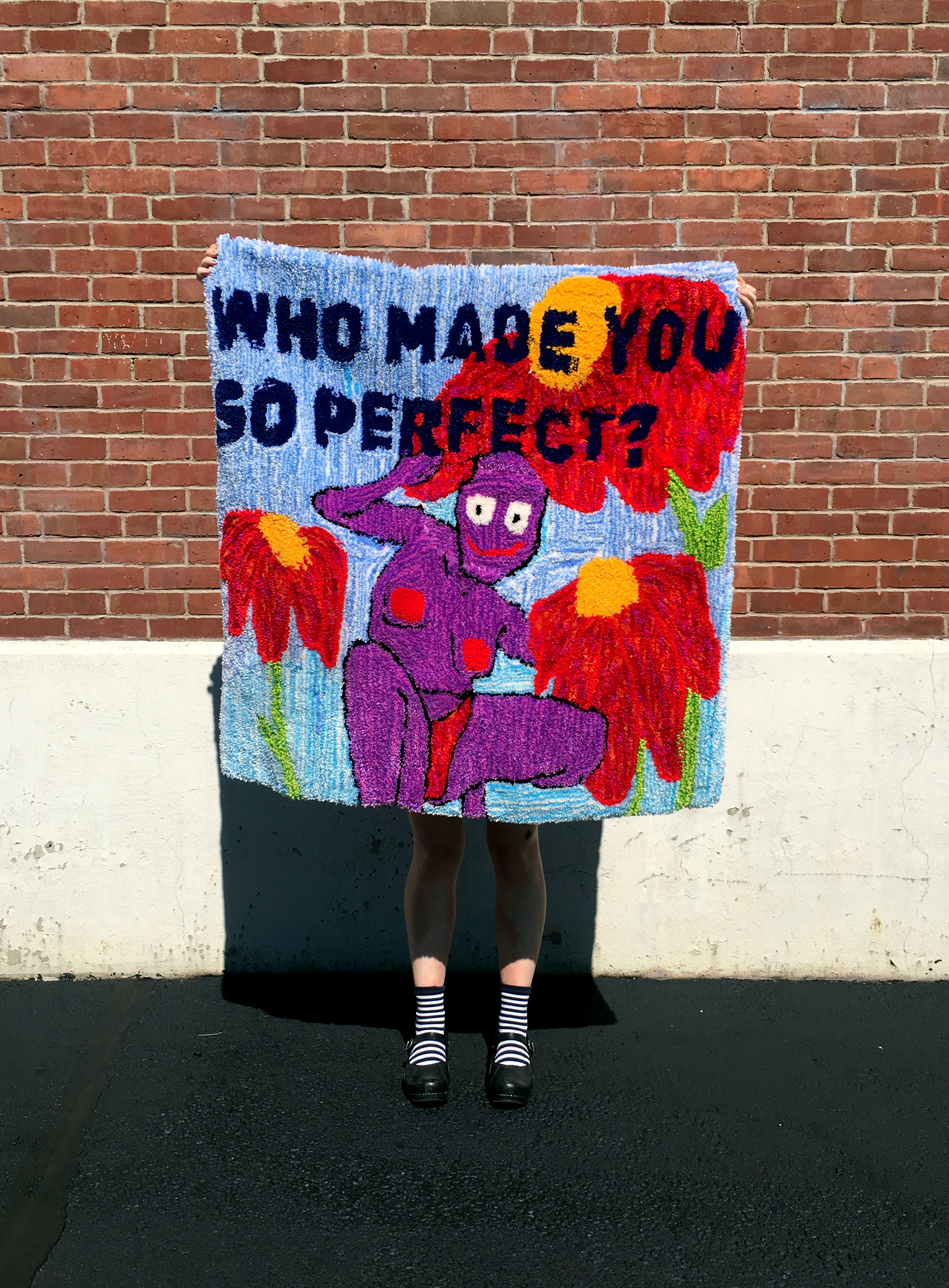 I am Ki Thayer a genderqueer artist and designer living in Providence, Rhode Island. With my tufting work, I searching for self-acceptance and love through creating these labor-intensive rugs of my nude body along with micro love letters. My rugs are not just for me but for everyone who sees them, whether they view themselves as the character, the receiver of the love letter, or both. <3